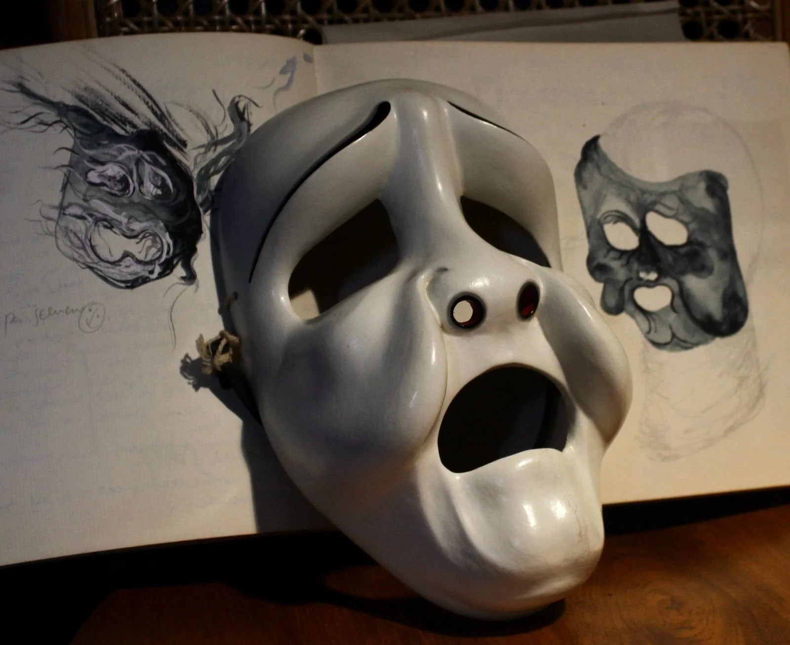 When work on a drawing of the mask starts, the drawing must be completed immediately to preserve it as the final expression. Then comes the fine pencilling, and finally, I paint the faces with aquarelle as a smooth inspiration for the mask artist. Not that the masks are ultimately to be painted like that.